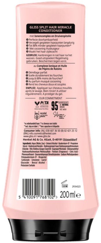 Gliss Split Hair Miracle Conditioner is speciaal ontworpen om langdurig gespleten haarpunten te herstellen en af te sluiten. Deze conditioner maakt deel uit van de Gliss Split Hair Miracle-serie, die is ontwikkeld om beschadigd haar met gespleten haarpunten te herstellen. Als u geen zin hebt om uw gespleten haarpunten te knippen, biedt deze speciale verzorgingslijn een oplossing. De producten in de Split Hair Miracle-serie van Gliss sluiten gespleten haarpunten langdurig af en geven het haar een sterk en gezond uiterlijk na gebruik.Gliss Split Hair Miracle Conditioner:De conditioner herstelt beschadigde haarvezels en zorgt voor langdurige verzegeling van gespleten haarpuntenMet een formule die voor 96% bestaat uit ingrediënten van natuurlijke oorsprong* (*inclusief water), biedt het product een natuurlijke samenstellingHet haar wordt verzacht door de speciale formuleOntwikkeld om specifiek beschadigd haar met gespleten haarpunten te herstellenDe formule bevat een ionencomplex en druivenpitolie, die de haarstructuur egaliseren vanaf de wortels tot aan de puntenMaakt het haar perfect doorkambaarGeeft het haar een sterk en gezond gevoelHoe te gebruiken?Breng de conditioner aan op nat en gewassen haar. Laat de conditioner even intrekken en was het daarna grondig uit.