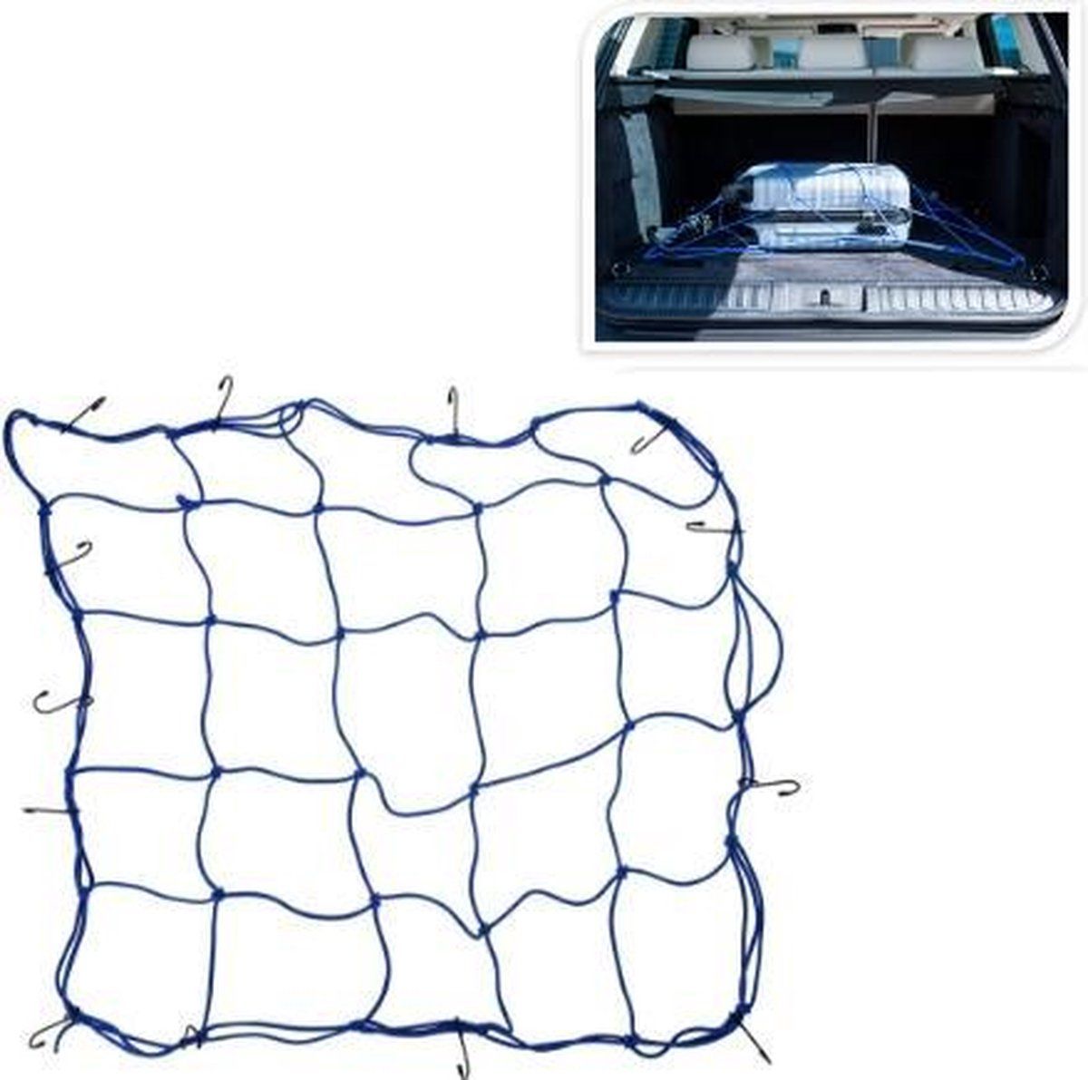 Kofferbaknet - Ga je vaak op reis met de auto en schuiven jouw spullen dan alle kanten op? Gelukkig kun je met dit bagagenet jouw koffer of andere spullen veilig vastzetten in de kofferbak. Het net heeft een afmeting van 75 bij 75 centimeter en 12 haken voor stevige bevestiging.Spullen vastzetten met opbergnet autoDit net in de kleur blauw is gemaakt van elastiek en bestaat uit 25 vierkantjes en 12 haken, waarmee jij jouw spullen stevig kunt vastzetten in de achterbak. Dit is ideaal omdat je hiermee schuiven voorkomt en daardoor zowel jouw kofferbak als spullen niet meer zullen beschadigen. Bovendien is het erg vervelend wanneer je bij elke bocht spullen hoort bewegen.Eigenschappen: Bagagenet voor auto Zet koffers of spullen stevig vast waardoor schuiven wordt voorkomen 12 haken en 25 vierkantjes voor optimale bevestiging Afmeting: 75 x 75 centimeter Materiaal: elastiek Kleur: blauw