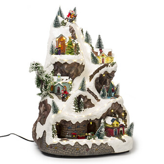 Uitgebreide kerst miniatuur - Er gebeurt een heleboel tegelijkertijd in dit leuke bergdorpje kersttafereel. Zo zijn er meerdere huisjes en (kerst)bomen te zien en zijn er mensen aan het sleeën, skiën of schaatsen. Daarbij rijdt er zelfs een treintje heen en weer en wordt er een muziekje (Carol of the Bells) afgespeeld. Je sluit dit tafereel eenvoudig aan op het stopcontact.Kersttafereel met treintje, huisjes, bomen en meerDit besneeuwde kersttafereel is gezellig en staat prachtig als kerstdecoratie in jouw huis of is een leuke toevoeging aan je kerstdorp. Het tafereel heeft een lengte van 33 centimeter, breedte van 33 centimeter en hoogte van 46 centimeter. Daarbij zijn er in dit exemplaar maar liefst 75 LEDs verwerkt die je aan kunt laten gaan door het tafereel aan te sluiten op het stopcontact. Bij aansluiting op stroom komen bovendien het treintje, alsmede andere bewegende elementen, in beweging en zal Carol of the Bells af gaan spelen.Eigenschappen: Besneeuwd bergdorpje kersttafereel Geeft warm wit LED licht (75 LEDs) Bevat bewegende onderdelen Geschikt voor binnen Eenvoudig aan te sluiten op stopcontact Muziek: Carol of the Bells Lengte: 33 centimeter Breedte: 33 centimeter Hoogte: 46 centimeter*Dit product kan indien gebruikt niet meer geretourneerd worden na de feestdagen.