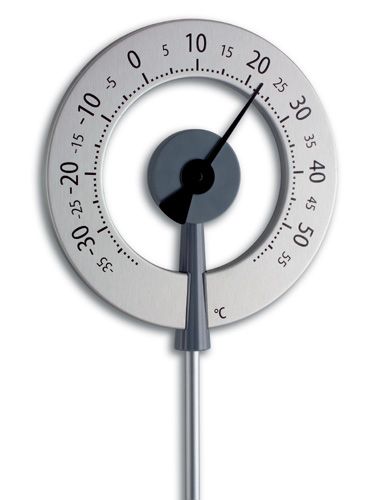 - extraordinary patented design,\n- with bimetallic POWER COIL,\n- scale and rod (separable) in eloxed aluminium,\n- weather resistant,\n- for putting in the ground,\n- anthracite with black pointer,\n- Ø 270 mm, 1190 mm, 910 g.