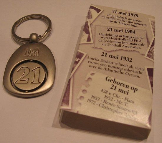 Een sleutelhanger voor een speciale dag om nooit te vergeten. Extra op het doosje gebeurtenissen en verjaardagen van beroemdheden van die specifieke dag. Een mooi aandenken.