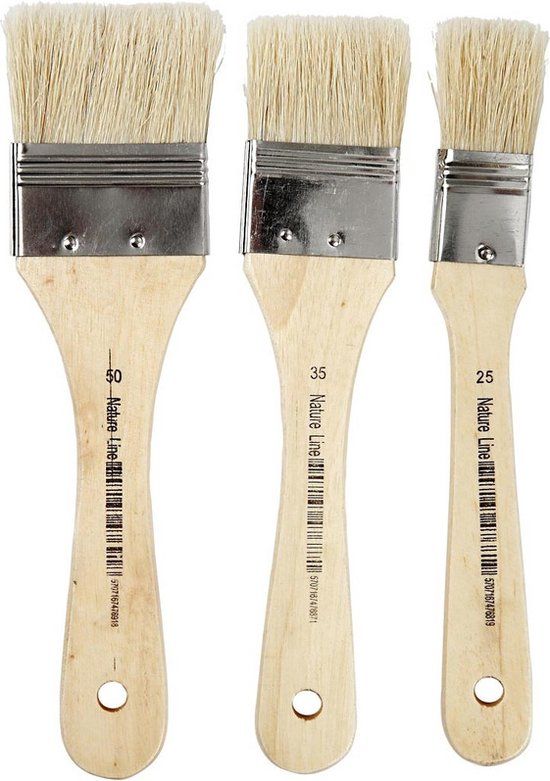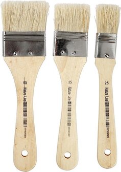 3x Verfkwasten plat met nylon haren. Set van 3 universele platte schilder verfkwasten welke geschikt zijn voor allerlei soorten verf, lijm en vernis. De kwasten hebben een formaat van 2,5, 3,5 en 5 cm. De haren zijn gemaakt van nylon.