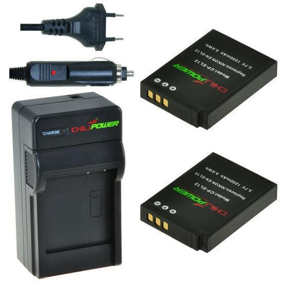 ChiliPower 2 x EN-EL12 accu's voor Nikon - inclusief oplader en autolader - Acculaders voor camera's
