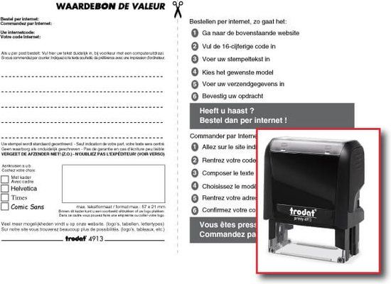 Inhoud van de doos: 1 Montuur voor de Trodat 4913: Ideaal voor het bevestigen van het stempelplaatje. 1 Stempelkussen: Geleverd in zwarte inkt, geschikt voor diverse toepassingen. 1 Waardebon voor een stempelplaatje: Laat een gepersonaliseerd rubber stempelplaatje maken in de maat 26x10 mm. Instructies voor het gebruik van de waardebon: Bezoek de website: Ga naar www.my-individual.eu, vul je waardeboncode in en ontwerp je eigen stempel. Gebruik de proefcode CW29-I5b1 om een indruk te krijgen van de website en de mogelijkheden. Vul je adresgegevens in: Je stempelplaatje wordt binnen 5 werkdagen naar het opgegeven adres gestuurd. Bevestig het stempelplaatje: Verwijder de beschermfolie van het dubbelzijdige tape en plak het stempelplaatje op het montuur. Je stempel is nu klaar voor gebruik!Reviews