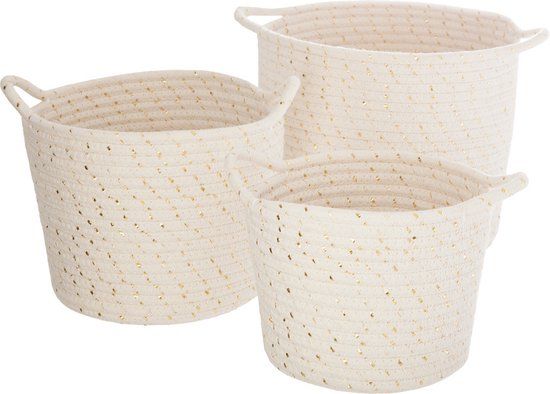 Deze opbergmanden set met goudvlokken van Atmosphera is ideaal voor bij jou in huis. Deze set heeft een prachtig design en mooie kwaliteit. Deze ronde manden zijn gemaakt van polyester. De opbergmanden set bestaat uit drie ronde manden met drie verschillende afmetingen. Small: 19,5 cm in diameter en 13 cm hoog. Medium: 22 cm in diameter en 16,5 cm hoog. Large: 24 cm in diameter en 21 cm hoog. Deze ronde manden bij jou in huis Begin nu met het organiseren en opruimen van kleding, knutselspullen, schoenen of speelgoed door gebruik te maken van deze set opbergmanden van Atmosphera