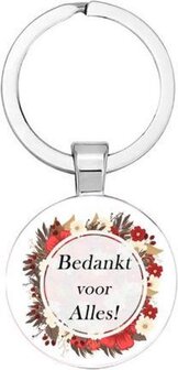 Deze Bedankt voor alles sleutelhanger is speciaal ontworpen voor Afscheidnemer en heeft het thema Afscheid Bedank cadeau. De sleutelhanger heeft een ronde vorm met een diameter van 25mm en is voorzien van een “dooming” glas. Er wordt een sleutelring mee geleverd waaraan de hanger is bevestigd. De sleutelhanger wordt geleverd in een Blister.