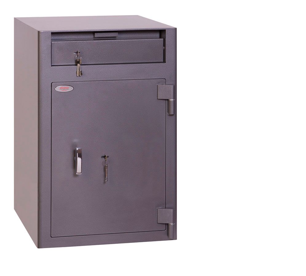 - Front Loading Cashier Deposit safe for 24 hour cash management\n- SECURITY PROTECTION: Recommended for overnight cash cover of £3,000 cash or £30,000 valuables\n- LOCKING: Fitted with a high security double bitted VdS class 1 keylock and supplied with two keys\n- DEPOSIT FACILITY: Fitted with a special Phoenix tilting baffle plate to ensure that the contents cannot be 'fished out'\n- CONSTRUCTION: Constructed of 6mm steel plate door and 2mm body\n- FIXING: Ready prepared for floor fixing, with fixing bolts for concrete supplied\n- COLOUR/FINISH: Finished in a high quality scratch resistant Graphite Grey paint RAL7024