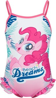 My Little Pony Badpak in de kleur roze met opdruk aan de voorkant. De tekst op dit My Little Pony Badpak is Beach Dreams