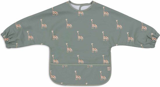 Deze slab met mouwen is geweldig! Als een schattig schortje beschermt het de kleertjes van jouw baby of dreumes extra goed, dankzij de handige mouwtjes. Ooit afgevraagd waarom er aan de onderkant een dubbel laagje stof zit? Daar is over nagedacht! Tijdens het zelfstandig eten druipt er geregeld voedsel langs de kin over de slab, maar de onderste rand van de slab vangt dit op als een handig opvangbakje. Dat ga je zeker waarderen! Niet alleen handig tijdens de maaltijden, maar ook bij knutselen en vingerverven. In ons schattige Jungle Jambo thema is deze slab nog leuker, versierd met giraffjes op een Ash Green kleurige achtergrond!