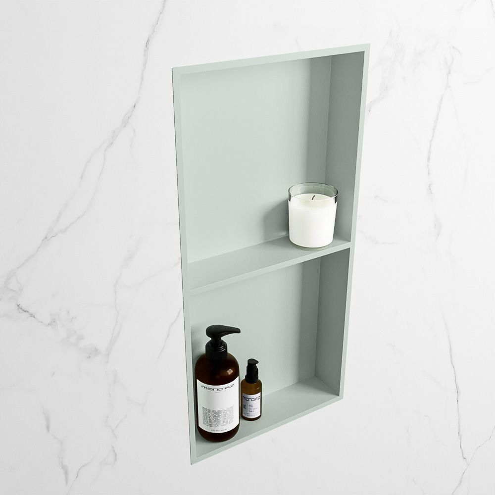 Deze Mondiaz Easy nis met 2 vakken heeft een afmeting van 60x30 cm. Hij is gemaakt van solid surface en is uitgevoerd in de kleur greey. Deze (inbouw) nis is een echte aanwinst voor in jouw badkamer. Dit komt door meerdere dingen zo is hij te koop in verschillende maten en kleuren. Ook heb je met deze nis de keuze om het in de muur te bouwen of om heb tegen de muur aan op te hangen. In de nis kun je gemakkelijk je douche of badproducten in opruimen. Hij heeft een breedte van 29,5cm, een hoogte van 59,5cm en hij heeft een dikte van 8cm. De Easy nis is goed te combineren met andere Mondiaz producten in de kleur greey.