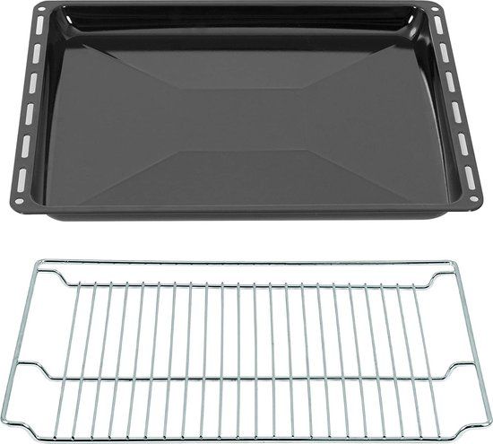 Deze set bestaat uit een geëmailleerde bakplaat van 3 cm diep met een afmeting van 465 x 370 x 30 mm en een verchroomd ovenrooster met een afmeting van 465 x 360 mm.