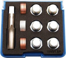 De reparatie set van BGS bevat de meest gangbare maten draadtappen. Met deze carterplug reparatieset kun je beschadigd M15x1.5 schroefdraad gemakkelijk repareren. Deze schade bevind zich vaak in aluminium carter pannen en is met deze set eenvoudig te repareren.
