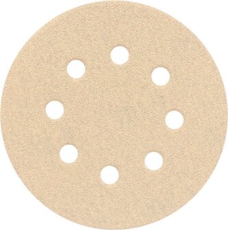 Type GLS 5, geschikt voor het schuren van schilderwerk, lak en plamuur. Na het schuren van staal, niet meer gebruiken op rvs, dit om roestvorming te voorkomen. Voorzien van klittenband aan de onderkant, voor snelhechtsystemen. Wit, 8 Gaten, 125 mm.