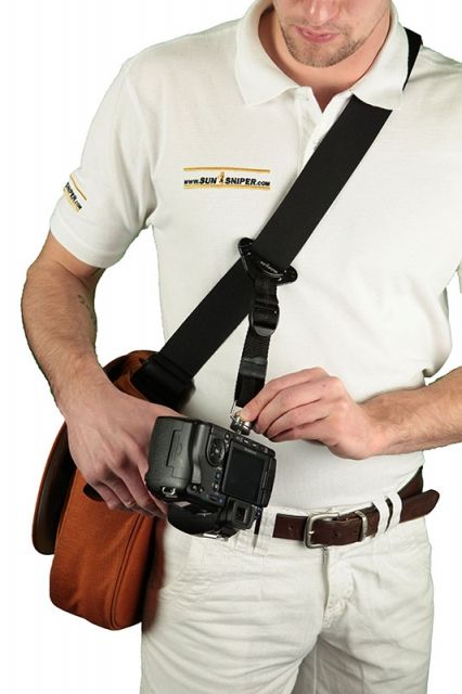 CONVENIENT AND PROFESSIONAL – the unique "STRAP-SURFER" by SUN-SNIPER.\n\nAnother innovation developed by the SUN-SNIPER TEAM in GERMANY turns your regular courier-style bag into a cool SUN-SNIPER camera Strap as well as a home for your valuable camera. Just clip the SURFER to your bags strap and attach the stainless steel bearing connector to you cameras tripod socket. Now, your camera is ready to glide from your hip to your eye –always safely connected. This is the most innovative pairing of a bag and a camera. The "STRAP-SURFER" uses your bag as a free-rider. Equipped with STEEL WIRE and STAINLESS STEEL BEARING connector. The STEEL WIRE comes with its own insurance.\n\n- The most innovative pairing of a bag and a camera.\n- Uses your own courier bag.\n- Includes all major SUN-SNIPER features.\n- Cutter-Crasher/ Steel Wire.\n- Insurance protected.\n\nThe SNIPER-STRAP THE "STRAP-SURFER" is designed for a camera weighing up to 3 kilograms.