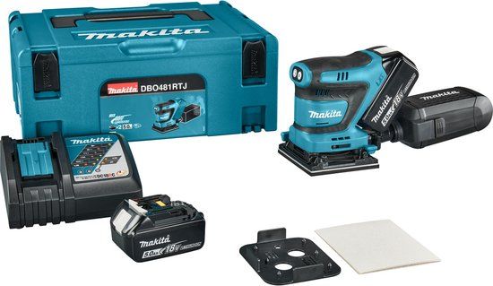 - 1 stuks Makita DBO481 Accu Handpalm Vlakschuurmachine 18V 2 stuks Makita Accu BL1850B LXT 18V 5.0Ah 1 stuks Makita Snellader LXT DC18RC 1 stuks Stofbox met papieren stofzak (135246-0) 1 stuks Perforatieplaat handpalm vlakschuurmachine (450066-4) 1 stuks Schuurpapierset (794296-0) 1 stuks Makita Mbox 2