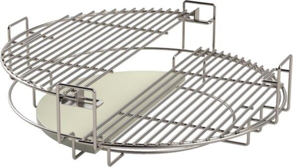 Dit systeem bestaat uit een 2 halve maan roosters, 2 halve maan hitteschilden en een rvs frame. Dit geeft je meer controle over het kookproces en biedt ruimte voor een extra rooster, waardoor je het grilloppervlak eenvoudig verdubbeld. Ideaal toch?