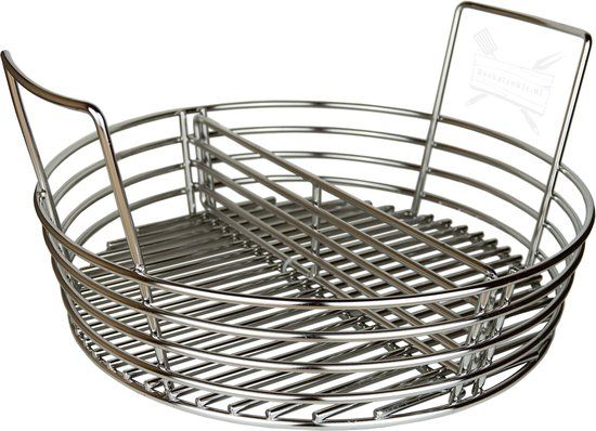 mand zitten, zodat je tijdens het schoonmaken alleen de bak uit je kamado hoeft te tillen en boven de vuilnisbak hoeft uit te kloppen. Ook gebruik je veel minder houtskool: overgebleven houtskool kun je in de Basket laten zitten, zodat je bij je volgende BBQ-sessie alleen wat houtskool hoeft bij te vullen. De Grill Guru Charcoal Basket is gemaakt van RVS en heeft een handige verdeler, waarmee je direct en indirecte kookzones in je kamado kunt maken.