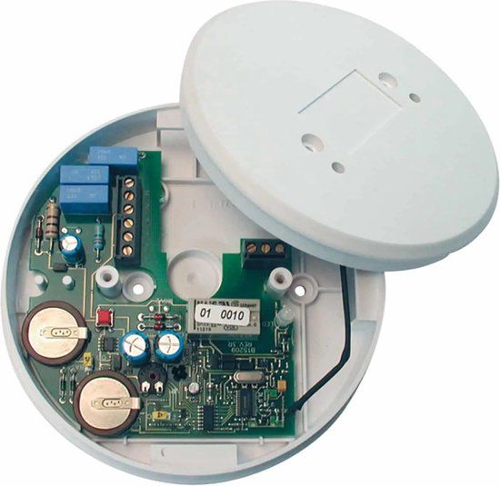 - Relaisbasis, wordt aangestuurd door een RF signaal\n- Toepassing: aansturen van een extra zwaailicht, sirene, branddeur met magneetsluiting of doormelding naar een alarmcentrale/brandmeldsysteem\n- Voedingsspanning 230Vac\n- Met 10-jaars lithium back-up die constant wordt bijgeladen\n- Relaiscontact NO/NC, 5A continu aan/uit of pulserend\n- Met LED’s voor controle van 230Vac en ontvangst RF signaal\n- Afmetingen Ø x h: 140 mm x 26 mm, kleur wit RAL9010 (bij benadering)