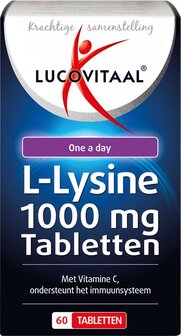 - Ingrediënten: L-Lysine HCI, vulmiddel (Cellulose), voedingszuur (Dicalciumfosfaat), antiklontermiddelen (Siliciumdioxide, Magnesiumstearaat, Stearinezuur), verdikkingsmiddele (Croscarmellose natrium), Vitamine C, Coating (Ethylcellulose). Samenstelling Hoeveelheid %RIL-Lysine (L-Lysine HCl) 1000 mg **Vitamine C (Ascorbinezuur) 12 mg 15%*RI = Referentie inname.**RI = Referentie inname is niet vastgesteld.
