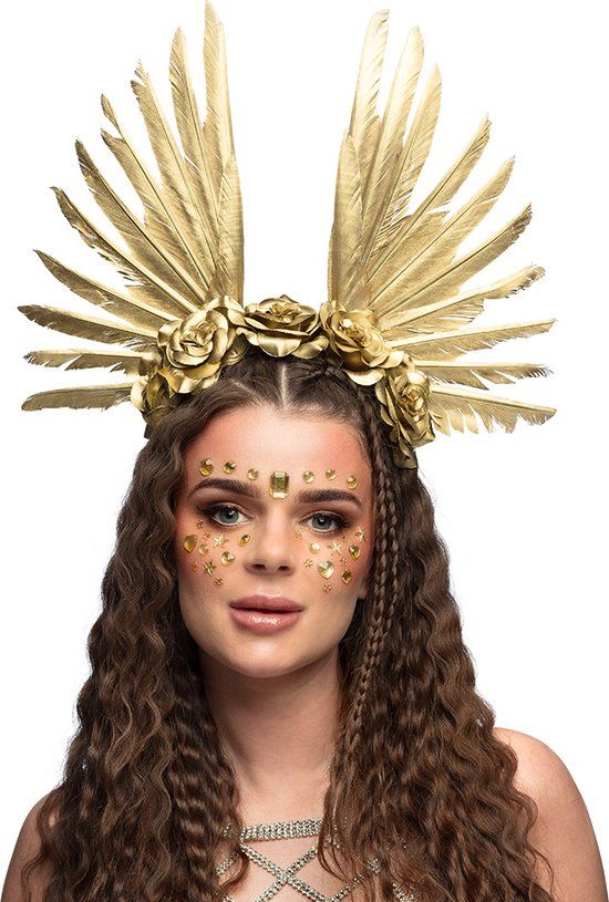 Ga voor een onvergetelijk boho look met deze betoverende goude halo kroon. De Stella halo crown diadeem heeft grote goude bloemen en grote opvallende veren. De perfecte accessoire voor een onvergetelijke festival outfit of een magische bruiloft look. Maar deze mooie tiara is ook zeker een must-have voor iedereen die tijdens Carnaval of een cosplay event verkleed gaat als godin of engel.