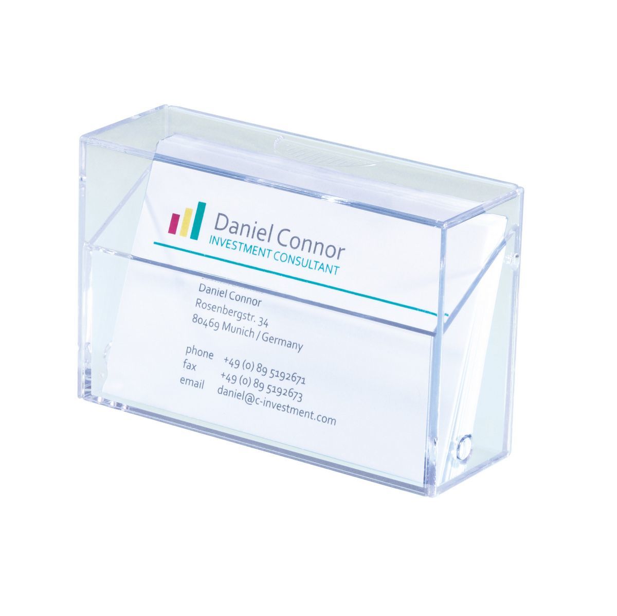 Glasheldere box voor visitekaartjes van hard plastic met een praktische dubbele functie: In gesloten toestand dient het als veilige bewaarbox en opengeklapt als standaard voor de presentatie van de visitekaartjes. In de box passen maximaal 100 visitekaartjes (max. 86 x 56 mm). De buitenafmetingen bedragen 100 x 70 x 10 mm (B x H x D).