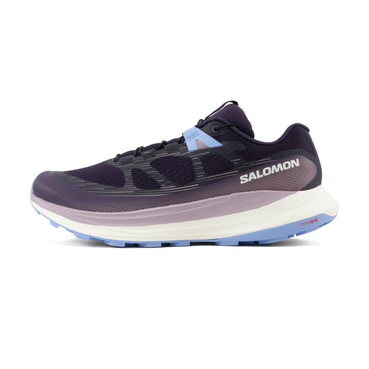 De Ultra Glide 2 zijn comfortabele trailschoenen. Salomon biedt lichtgewicht comfort, een optimale pasvorm en veel grip zodat je alle terreinen aan kunt. De Ultra Glide 2 trailschoenen zijn speciaal ontworpen voor het lopen van lange afstanden op onverharde paden en op niet al te technische trailpaden. Wat zijn de updates? De grootste update zien we in het bovenwerk van deze trailschoen. Het lichtgewicht en duurzame Engineered mesh biedt optimale ondersteuning en houdt je voeten op zijn plaats. Er zijn extra verstevigingen aangebracht bij het teengedeelte om je voeten te beschermen tegen scherpe obstakels. Het 3D Stretch Air Mesh-bovenwerk biedt een zeer hoog ademend vermogen en veel flexibiliteit. De Sensifit-technologie aan de binnenkant van de schoen omsluit de voet. Het past de voorvoet en middenvoet ondersteuning aan aan je voeten, zodat je gedurende de lange afstanden continue demping en ondersteuning ervaart. Het Quicklace-systeem bevat een minimalistisch en sterke veter die je gemakkelijk met één hand aan kunt trekken. De lichtgewicht tussenzool is gemaakt van responsief schuim. De combinatie van EVA - en Olefin [OBC] materiaal zorgt voor langdurige demping en veerkrachtige energieteruggave. De gebogen geometrie (Reverse Camber genoemd) van de tussenzool versterkt het responsieve karakter en de energieteruggave. De slijtzool bestaat uit Contagrip® MA. Dit materiaal zorgt voor grip op de meest uiteenlopende ondergronden. Zowel de geometrie als de rubbersamenstelling zijn in balans voor vertrouwen op natte, droge, harde of losse ondergronden. Daarnaast is de slijtzool duurzaam op lange termijn. Het noppenprofiel is aangepast ten opzichte van de voorganger. De noppen hebben nu een lengte van 3,5mm in plaats van 4mm.