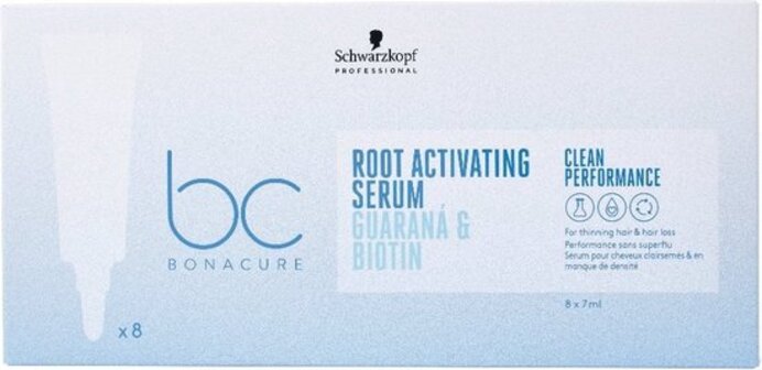 Schwarzkopf Professional Bonacure Scalp Care Root Activating Serum is geformuleerd voor zwak en dunner wordend haar, en vermindert haarverlies door de haarwortels te activeren. De hoofdhuid wordt gestimuleerd door de unieke formule verrijkt met Guaraná en Biotine. Het bevordert voller uitziend haar, terwijl het de kwaliteit en vitaliteit verbetert. De hoofdhuid wordt opnieuw in balans gebracht en de toekomstige conditie van het haar wordt gewaarborgd. het serum vermindert niet-pathologisch haaruitval na slechts 6 weken en maakt het haar niet vettig.