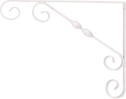 1x Witte stalen plankdrager/planksteun Jutta 23 x 18 cm tot 30 kg. Stevige plankdrager ornament van metaal, met decoratieve krullen. De drager heeft meerdere voorgeboorde gaten waardoor u deze aan de wand kunt bevestigen, maar ook de door u gekozen plank aan de drager vast kunt schroeven. De drager/console is keerbaar, en afhankelijk van welke zijde u aan de muur heeft bevestigd, daardoor geschikt voor planken van 20 en 30 cm diep.