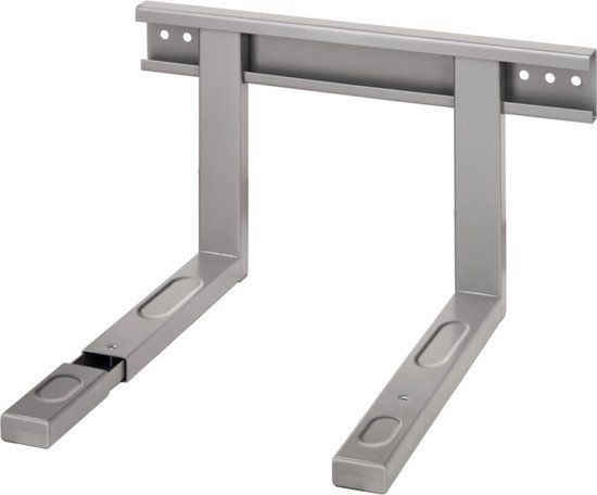 - Universal wall bracket for microwaves, grill ovens and other electrical appliances.\n- Space-saving and easy mounting.\n- The width and depth can be adjusted.\n- Stamped-in hollows ensure secure positioning of the appliance.\n- Max. load capacity: 40 kg.\n- Max. width: 40 cm.\n- Max. depth: 50 cm.\n- Colour: silver.