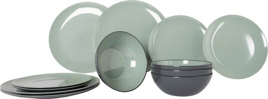 Een stijlvolle groene serviesset uit de Vivid line collectie. 100% melamine van hoge kwaliteit, vrijwel onbreekbaar en kraswerend. De set bestaat uit 12 delen. Het servies is geluiddempend en hygienisch door de vervangbare antislip oplossing. Daarnaast wordt de serviesset geleverd inclusief een handige en luxe stofzak. Ideaal voor op de camping, thuis of voor op de boot. Bovendien is het servies lichtgewicht, geschikt voor in de vaatwasser en food approved. Afmetingen: Dinerbord Ø 25 cm, ontbijtbord Ø 20,5 cm, kom Ø 15,5 cm.