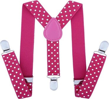 Stoere bretels met stippen geschikt voor kinderen van ongeveer 3 tot 8 jaar en met een lengte van 80-125cm. De bretels hebben een lengte van 65cm en zijn 25mm breed. Ze zijn eenvoudig in lengte te verstellen door de stalen clips.