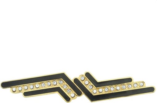 Goudkleurige broche met steentjes. Lengte 1,5 cm, breedte 7,5cm.