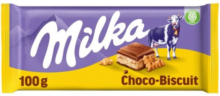Milka Chocolade Reep Chocobiscuit is een tablet van knapperig biscuit met een laagje melk crème omhuld door heerlijke Milka melkchocolade.