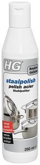 HG staalpolish is hét onderhoudsmiddel voor: roestvrijstalen aanrechtbladen, pannen en keukengerei. Maar ook voor aluminium en koperen pannen, kunststof aanrechtbladen, chromen kranen, fluitketels en elektrische kookplaten. HG staalpolish reinigt, glanst en beschermt in één behandeling. Doe een beetje HG staalpolish op een vochtig doekje en wrijf de ondergrond of het voorwerp stevig in. Vervolgens met een uitgespoeld doekje opwrijven.