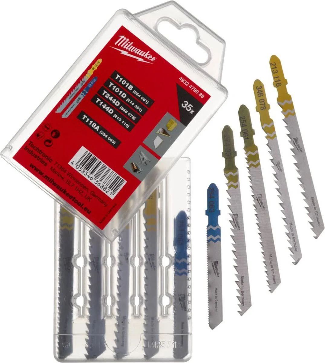 Zaagbladen met T-schacht. Geschikt voor de belangrijkste merken: AEG, Bosch, DeWalt, Festool, Hitachi, Hilti, Mafell, Makita, Metabo, MILWAUKEE , Ryobi. inhoud box zagen 7 x Hout snel zagen T144D 7 x Hout schoon zagen T101D 7 x Hout fijn zagen T101B 7 x Hout bochten zagen T244D 7 x Alle metalen T 118A Op onze verpakking vindt u dezelfde kleurcodering als op de zaagbladen, evenals pictogrammen om te verzekeren dat u altijd het correcte decoupeerzaagblad kiest voor de juiste toepassing. De bladlengte staat voor de sectie van het zaagblad met zaagtanden De tandafstand is gemeten in millimeters (mm) van tandpunt tot tandpunt (B-mm). Keuze van de juiste tandafstand is afhankelijk van de dikte van het te zagen materiaal. De gouden regel is om te allen tijde drie tanden op het te zagen materiaal te hebben; bijvoorbeeld voor dik materiaal zoals metaal met een dikte van ruim 4 mm wordt een tandafstand van 2 mm of meer aanbevolen. Voor metalen met een dikte van 1.5 – 3.5 mm, is een tandafstand van 1.2 tot 1.4 wenselijk. Bij zagen van dun metaalplaatmateriaal dunner dan 1.5 mm wordt een tandafstand van 0.7 tot 1.2 mm aanbevolen. De algemene regel bij het zagen van hout is hoe hoger de tandafstand des te sneller en ruwer of grover de zaagsnede zal zijn. Bij zagen van extreem dun plaatmateriaal is het raadzaam het materiaal op een dikkere ondergrond te leggen om te voorkomen dat het materiaal breekt. Wij adviseren het gebruik van koelmiddel om de levensduur van het zaagblad te verlengen, ingeval van zagen van metaal en kunststof. De kleurcode van de schachtopname geeft de toepassing aan GEEL Voor alle soorten hout, gelamineerd spaanplaat, spaanplaat, triplex, meubelplaat en kunststof. Zilverkleurige body. BLAUW Voor alle soorten ferro en non-ferro metalen, staal, aluminium, brons, koper, roestvrijstaal, lood, tin en sandwichmaterialen. Zilverkleurige body. ZWART Voor een grote variëteit aan materialen zoals karton, rubber, fiberglas, foam en schurende materialen. Zwartkleurige body. GEEL Bi-metalen zaagbladen hebben een witte body en dan de corresponderende schachtkleur; geel voor hout en blauw voor metaal.