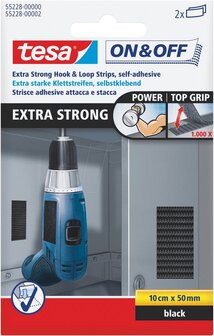 tesa On & Off Extra Strong Strips are self-adhesive heavy duty hook & loop strips that enable numerous applications all around the house. They are a great idea to quickly attach tools to your ladder to keep them handy while renovating your home. They are ideal to attach any heavy item to the wall while giving you the option to take it down and put it back anytime. They are simply perfect to organize all the tools of your workshop with minimum effort. Simply use these general purpose on and off strips for organizing your tools and as an easy means for better home organization.\n\nDid you ever waste time looking for that particular tool you put “somewhere” the last time you used it? Do you sometimes wish to have an additional hand when you are up the ladder trying to hang up a lamp? Are you still looking for that perfect system to organize your workshop? tesa On & Off Extra Strong Strips are the smart answer for easy home organization, tool fixation and cable management.\n\nHook & loop strip with heavy-duty qualities\n\ntesa On & Off Extra Strong Strips are self-adhesive hook & loop strips that are 10 cm long and 5 cm wide. These extra strong on and off strips consist of two parts designed for perfect interaction. The hook strip features a very robust hook material made of multiple claws for superior holding power. Its counterpart is made from special fleece material. Both strips are equipped with a self-adhesive backing offering strong adhesion on tools, walls or any other sufficiently flat surface.\n\nOrganizing tools in home and office\n\ntesa On & Off Extra Strong Strips are the perfect solution for smart and easy home organization. Use them in your workshop to keep even heavy power tools on display and ready for action. Attach them to kitchen and office walls to keep office utensils and household accessories within easy reach. Stick them to your ladder to hold all those tools you need to have at hand when working overhead.\n\nHome organization the easy way\n\ntesa On & Off Extra Strong Strips are not only strong on and off strips for solid and reliable attachment. They are also allow you to easily attach things, take them off and reattach them thousands of times. Use these general purpose strips to give tools, household appliances and office equipment a dedicated place in your home where you can quickly grab them and put them back without any extra efforts.