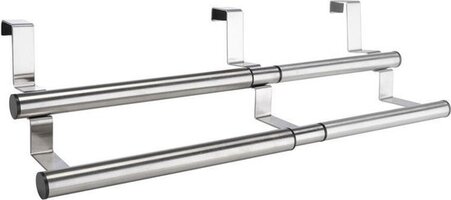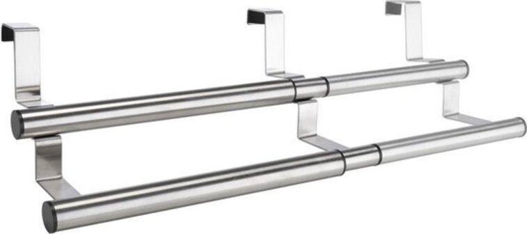 Verstelbaar theedoek / handdoek rek voor bijvoorbeeld over een kastdeurtje. Ruimte voor 2 handdoeken of theedoeken. Formaat: verstelbaar tot ongeveer 25 - 40 cm (waarvan het hanggedeelte: 19 - 33 cm) x 13,5 x 12 cm. Materiaal: RVS. Handdoek rekken/houders voor in de keuken.