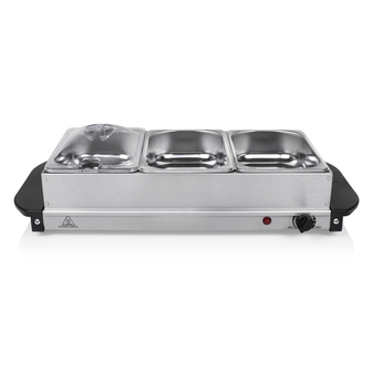 De verwarmingsbakken hebben samen een inhoud van 4.2 liter. Deze zijn daarnaast gemaakt van roestvrijstaal (RVS). Wanneer de onderliggende warmteplaat opwarmt, zullen de bakken ook langzaam warm worden. Het eten wat dan in de bakken zit blijft daardoor goed op temperatuur. Ideaal voor als je een keer een feestje hebt. Ook kan je de Buffet Serveerder buiten zetten zonder dat je bang hoeft te zijn dat er iets in je eten komt. De verwarmingsbakken hebben namelijk een deksel die je eten beschermen. De warmte blijft op deze manier ook goed binnen de bakken.