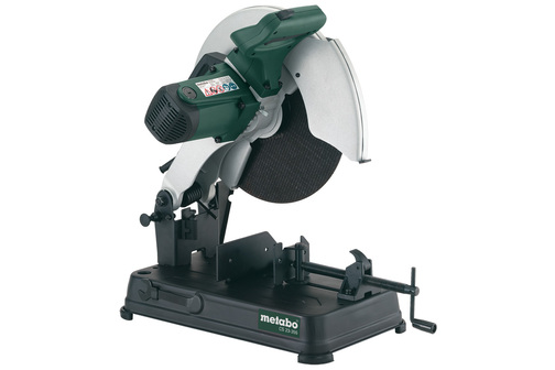 - For single phase alternating current\n- Powerful and fast cutting for profiles, pipes and rods made of steel, cast iron, aluminium and other non-ferrous metals.\n- Motor and gear with ball bearing for high loads\n- Spindle lock for easy disc change\n- Quick clamping device with variable mitre conversion from -15° up to 45°\n- Easy to transport due to built-in handle and locking device\n- High safety thanks to swivelling cutting guard\n- Storage for double-ended wrench at the machine table\n- Safe working thanks to adjustable spark guide plate\n- Adjustable cutting depth limiter