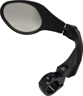 Mirage fietsspiegel de luxe draaibaar + klem op kaart. Kleur zwart. De spiegel is van onbreekbaar glas en verweerd niet. Behuizing en steun zijn van hoogwaardig kunstof. De bouten en metalen onderdelen zijn roestvrij. Voorzijde is voorzien van een reflector. Makkelijk instelbaar voor elke hoek. Aanbevolen voor gebruik bij hoge snelheden o.a.:race- of E-bikes/electrische fietsen. Met deze spiegel krijg je direct een goed beeld van het verkeer achter je. De spiegel bevestig je eenvoudig aan de linker binnenkant van het stuur. De spiegelarm klapt weg bij een botsing en heeft op de achterzijde een reflector zitten, zodat je ook in het donker altijd goed zichtbaar bent. Productspecificaties: Kleur: zwart Materiaal: kunststof Diameter spiegelblad: 9 cm Totale lengte spiegel: 20 cm Type fiets: stadsfiets, elektrische fiets Klemdiameter: 22,2 mm