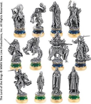 The Return of the King 12 schaakstukken. Deze partij van 12 stuks van tin (6 + 6 groen stuks blauw stuks) vertegenwoordigt de personages in het derde deel van de trilogie: