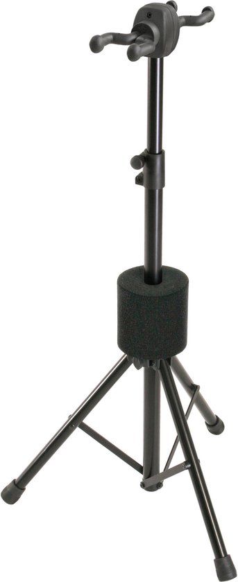Double storage with »Double«! Wherever space is at a premium. The new stand for 2 guitars is proving very popular. Acoustic, electric or bass guitar – the patented hanger grasps the guitars firmly and securely. The firm grip is provided by the individual protectively covered moveable support arms. The large lobes on the holder ends prevent the guitar rotating or accidentally falling from the hanger. The large soft foam roll protects the body of the guitar and gives the stand its unique look. The stand folds quickly and compactly for transport.