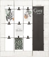 Metaal rotan Accessoires Deze stijlvolle Atmosphera Cosy wandrek fotohouder heeft 9 fotolijstjes in metaal rotan, plus accessoires, en een krijtbord! Het is perfect voor het weergeven van dierbare herinneringen in elke kamer. De hoogwaardige materialen zorgen voor duurzaamheid en een lange levensduur. Het product meet 60 x 68 cm voor optimale ruimtebesparing.