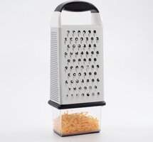 The OXO Good Grips Box Grater does the work of a slicer and three Graters in one compact tool that fits conveniently in any drawer. Wide stainless steel coarse and medium grating surfaces are ideal for cheese, vegetables, chocolate and more. A slimmer fine grating surface is just right for nutmeg and ginger, and the slicing surface yields perfect slices of cucumber, zucchini, cheese and more. The soft, comfortable, non-slip handle ensures a secure grip and cushions hands during repetitive grating motions. A non-slip base keeps the Box Grater steady on a plate or cutting board. A convenient storage container with non-slip base, measurement markings and a lid attaches to the bottom of the Grater for catching and storing freshly grated ingredients. The container stores conveniently inside the Grater when not in use.