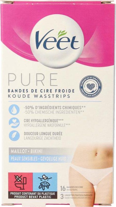 - BIKINILIJN : Het pakket bevat 16 Veet PURE ontharingsstrips voor de bikinilijn ontharing en 3 perfect-finish doekjes