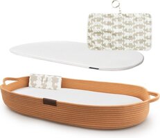 Vergelijkbaar met de populaire Mozes mandjes is de Yunioo 'baby changing basket' voorzien van handvatten. We hebben ervoor gekozen om deze aan de uiteinden te plaatsen, zodat ze niet in de weg zitten bij het verschonen. Door zijn lichtgewicht en flexibel materiaal is de mand gemakkelijk te verplaatsen in en om het huis om bijvoorbeeld gebruikt te worden op bed, op de bank of bij lekker weer in de tuin :-).