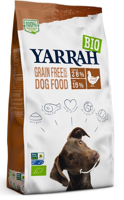 Wil je jouw hond een lekkere graanvrije maaltijd voorschotelen met biologische kip en vis gecombineerd erwten en lupine? Kies dan voor Biologisch Grain-Free Hondenvoer van Yarrah. Een complete, voedzame en zeer smakelijke voeding voor volwassen honden.