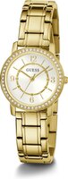 Guess GW0468L2 horloge dames staal goldplated 32 mm met witte wijzerplaat met gouden accenten en daaromheen briljant geslepen zirconia's