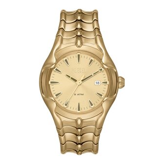 Dit Diesel Vert horloge van 44 mm heeft een goudkleurige sunray-wijzerplaat, uurwerk met drie wijzers en datum, en een goudkleurige roestvrijstalen armband.