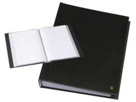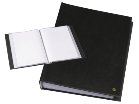 Rillstab showalbum A4 is vervaardigd uit generfd kunststof materiaal. In het midden het Rillstab mechaniek voorzien van binnentassen. Verschillende capaciteiten leverbaar. Aan de rechter binnenzijde een verticaal insteekvak over de volledige hoogte voor A4 documenten. Kleur zwart.